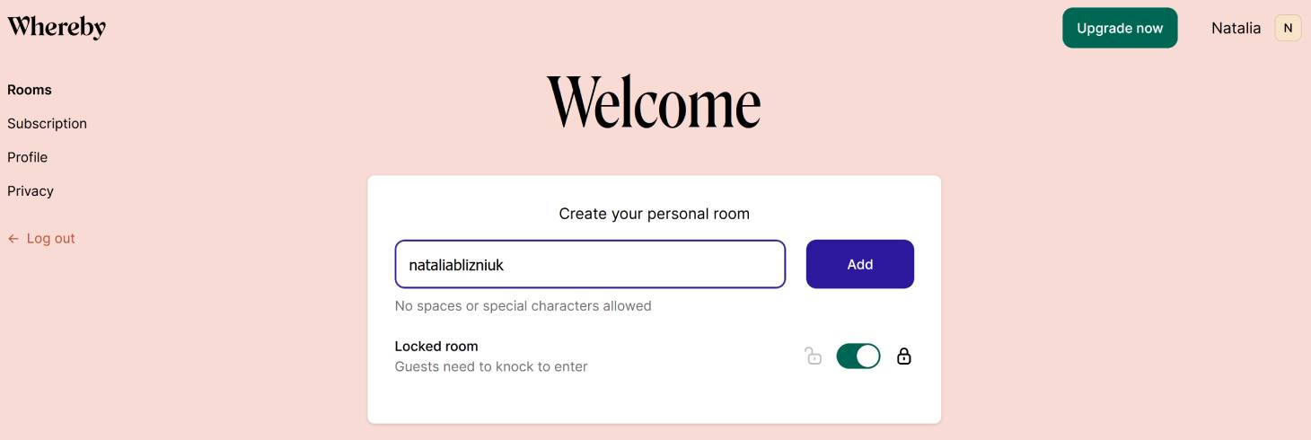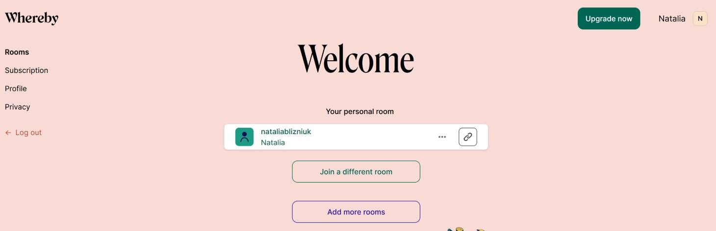 Załóżmy, że to jest nasz link: https://whereby.com/padadeszcz. W momencie rozpoczęcia spotkania wysyłamy ten link do osób, które chcemy zaprosić i sami również wchodzimy w ten link. I to wszystko. Nie ma konieczności logowania się do narzędzia, aby konfigurować jakiekolwiek ustawienia. Nasz link to miejsce naszych spotkań online.