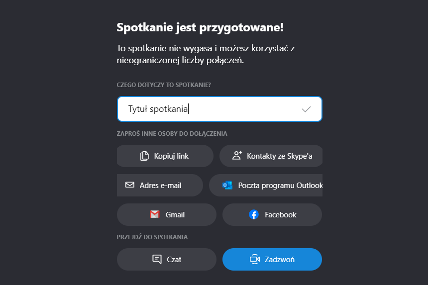 a) pobrać od razu link do spotkania, aby go udostępnić. Zostanie wygenerowany link do spotkania, który można udostępnić teraz lub później. W zależności od tego, na kiedy masz zaplanowane spotkanie. I wówczas, kiedy przyjdzie czas odbycia rozmowy wystarczy po prostu wejść w ten link.
