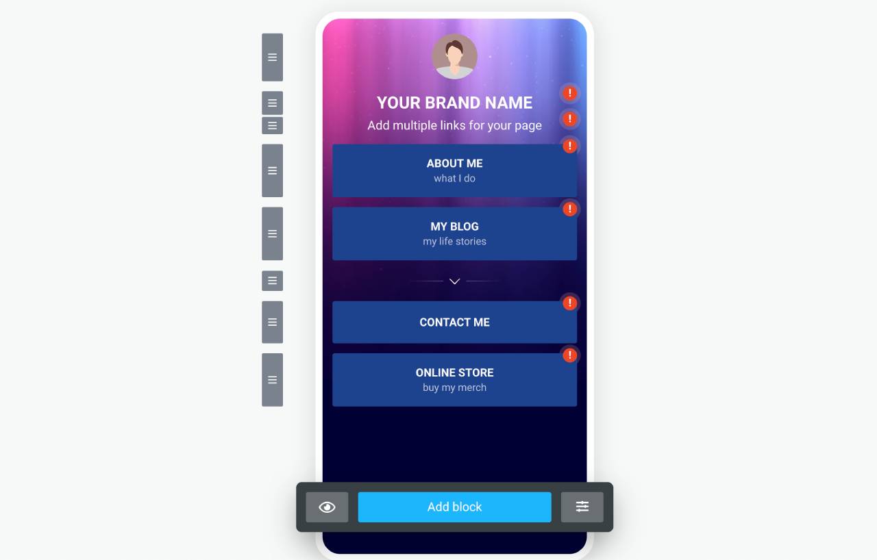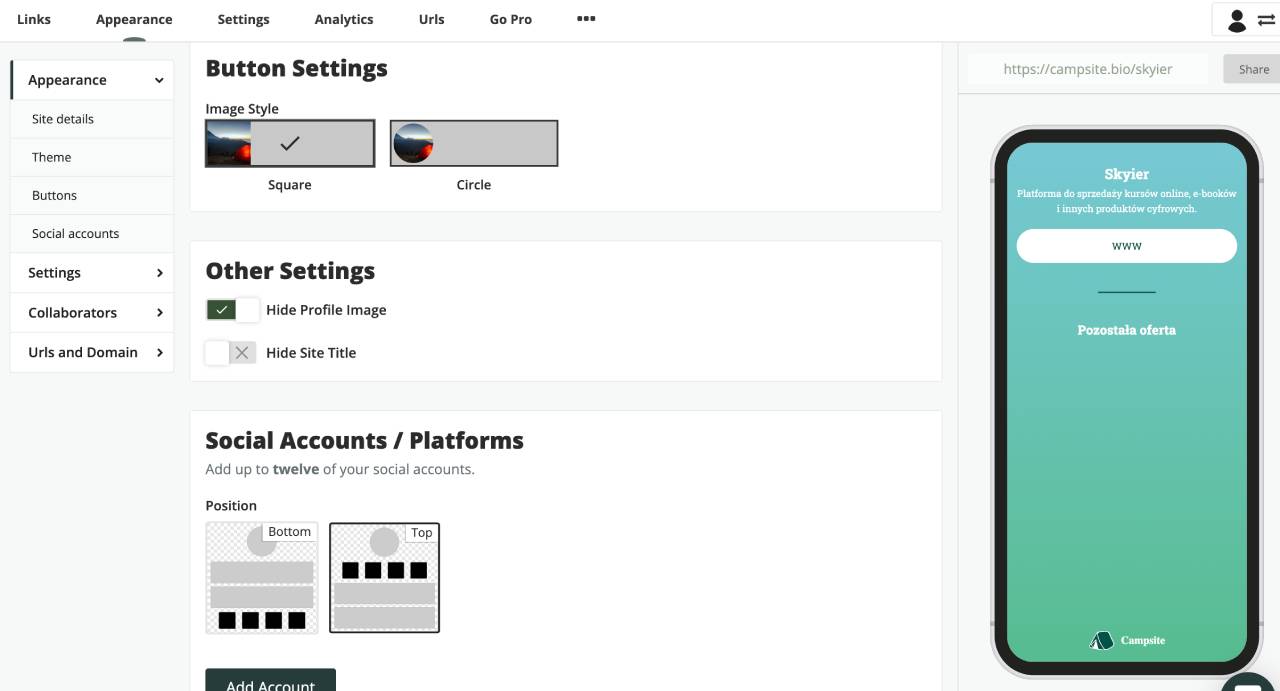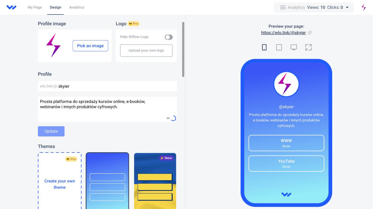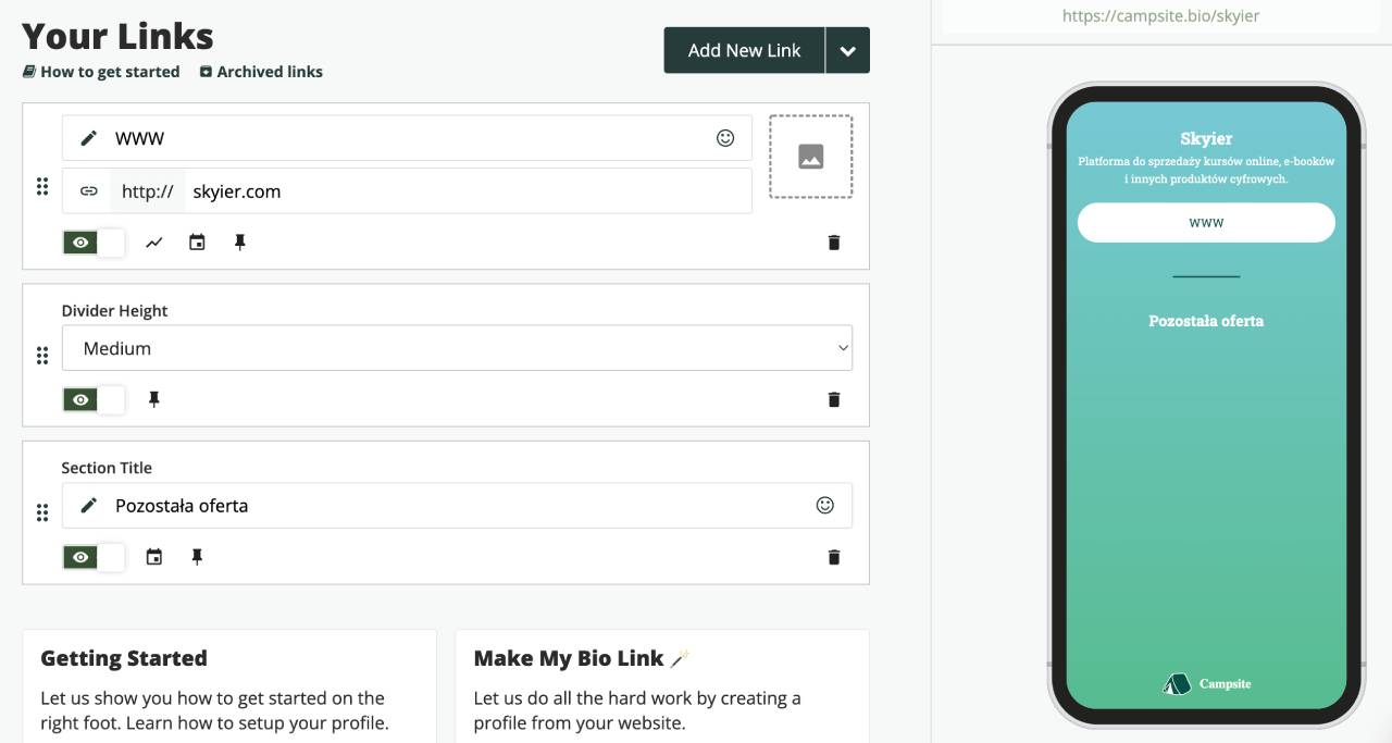 Posiada wersję darmową, która daje dostęp do nielimitowanej ilości linków oraz kilku wybranych szablonów. Dodatkowo swoją stronę możesz wzbogacić innymi sekcjami, takimi jak: linia rozdzielająca, sekcja pytań i odpowiedzi czy zdjęcie z tekstem. Oraz zmienić kolor tła, wybrać rodzaj fontu, kolor linku czy ustawić wielkość marginesów. Podsumowując, umożliwia również dużą customizację.