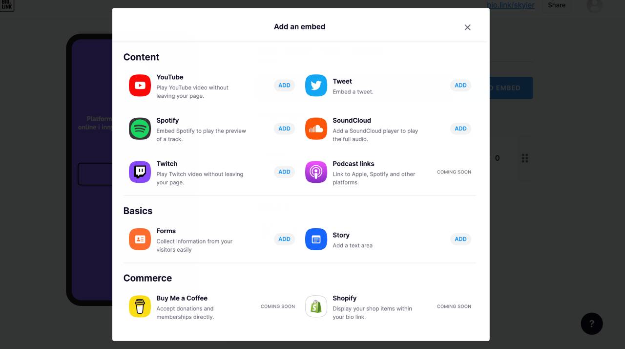 Posiada wersję darmową, w której oferuje między innymi: dostęp do wybranych szablonów, dodanie nielimitowanej wersji linków, w tym linków do filmików na YouTube czy osadzonych na innych stronach, Twittera, muzyki, podcastów, pobierania opłat (posiada integrację z Paypal), sprzedaży produktów (posiada integrację z Shopify i Spring), możliwość pokazanie danych kontaktowych i godzin, kiedy jesteś dostępny. To są tylko przykładowe funkcje, wszystkie dostępne w wersji darmowej znajdziesz tutaj.