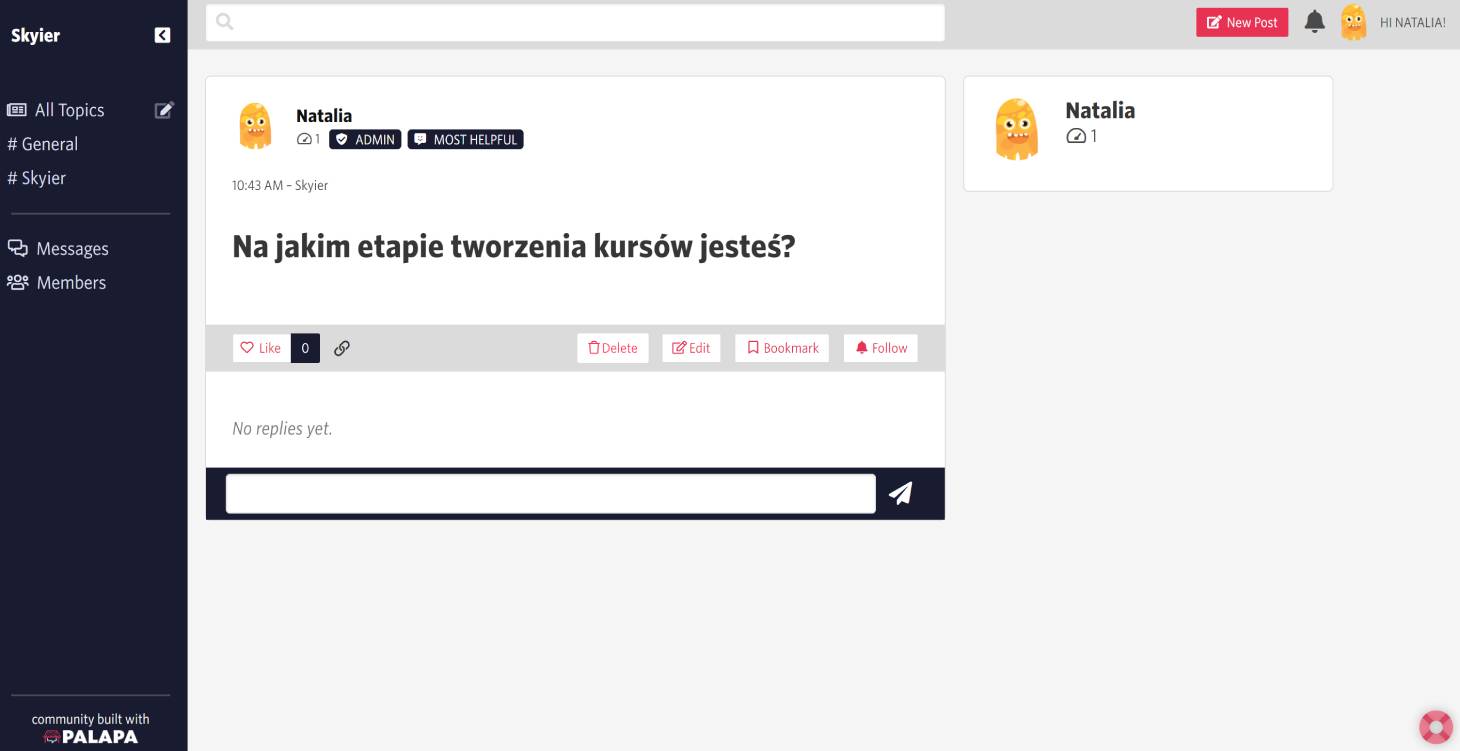 Palapa to moje kolejne odkrycie. Platforma w swojej funkcjonalności skupia się przede wszystkim na możliwości tworzenia społeczności. Umożliwia dodanie wielu kategorii tematycznych, standardowych postów w obrębie tych kategorii, zapraszanie uczestników czy wysyłanie wiadomości do wybranych osób. Niestety nie ma możliwości przypisania uczestnika to konkretnego kanału tematycznego. Inaczej mówiąc uczestnik ma dostęp do wszystkiego.
