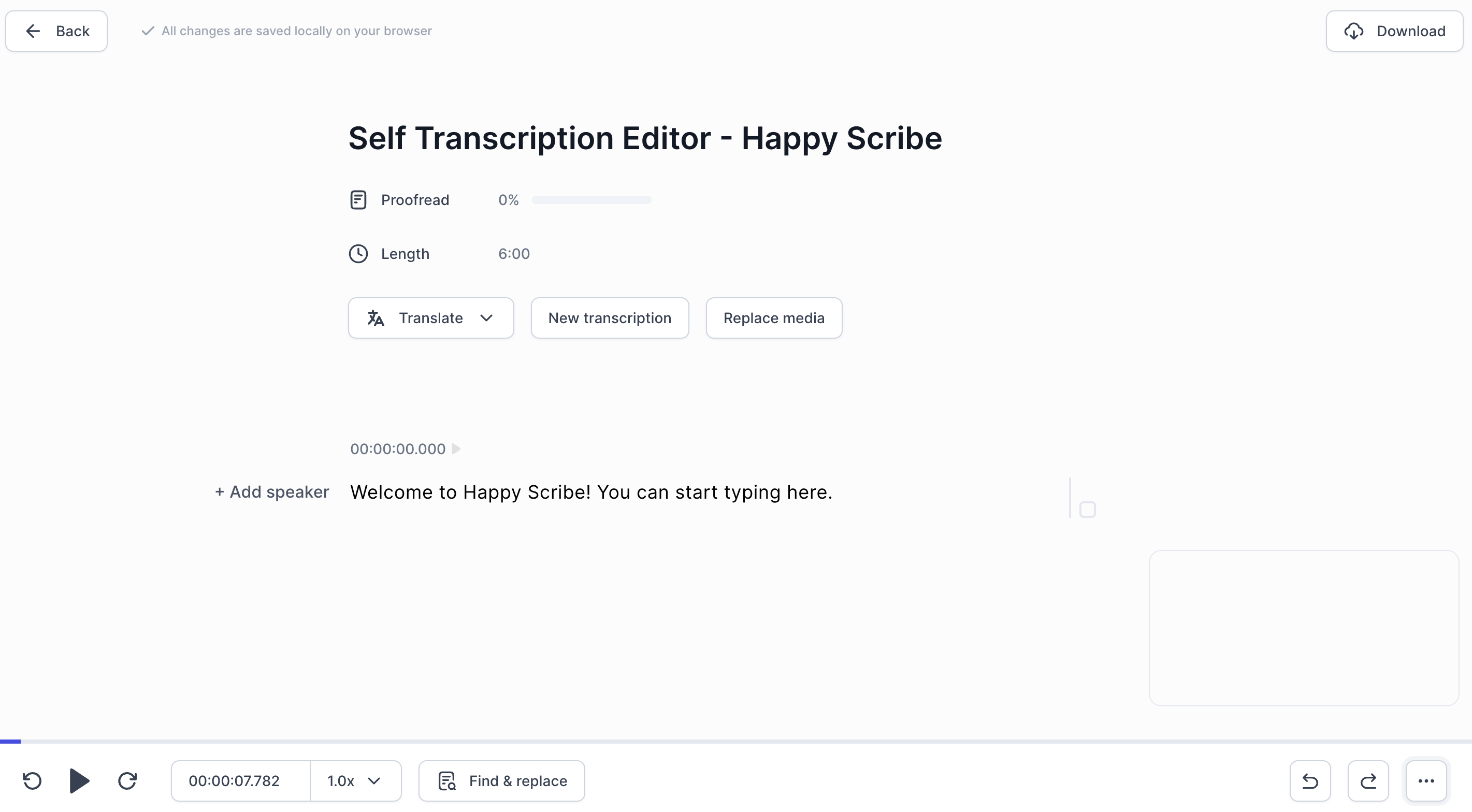 HappyScribe to druga propozycja. W swojej ofercie posiada również usługę robienia transkrypcji automatycznej. Koszt takiej usługi wynosi: $0,2/minuta. Jeśli natomiast zależy Ci na czymś darmowym to zawsze możesz skorzystać z ich edytora, który może ułatwić Ci pracę. Zasada działania jest taka sama. Ładujesz plik wideo/audio, włączasz odtwarzanie nagrania i piszesz.