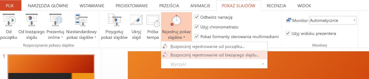 Krok 1. Upewnij się, czy Twoja wersja programu PowerPoint potrafi nagrywać dźwięk. Osobiście korzystam z wersji 2013. I w moim przypadku dostępna jest opcja "Rejestruj pokaz slajdów". W wersjach wyższych, np. 2020 opcja ta nazywa się "Nagraj pokaz slajdów". Opcję tą znajdziesz w zakładce POKAZ SLAJDÓW.