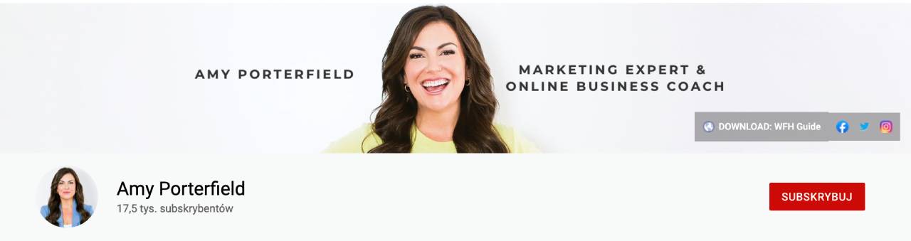 Amy Porterfield (marketing, coach) umieszcza link bezpośrednio na swoim banerze (Download WFH Guide).