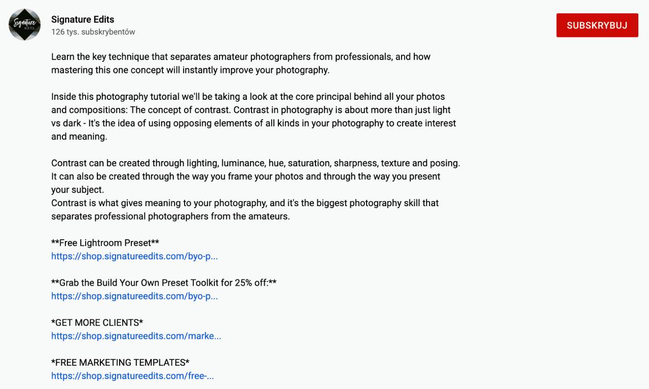 Signature Edits (fotograf, obsługa narzędzi do obróbki zdjęć ) w opisie na temat kanału i bezpośrednio pod filmikami. Oferując różne rodzaje lead magnetu, ale również płatne kursy online.