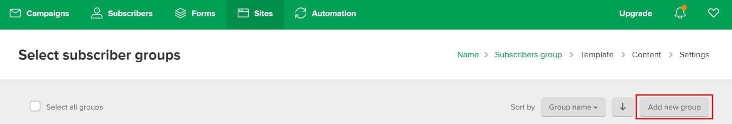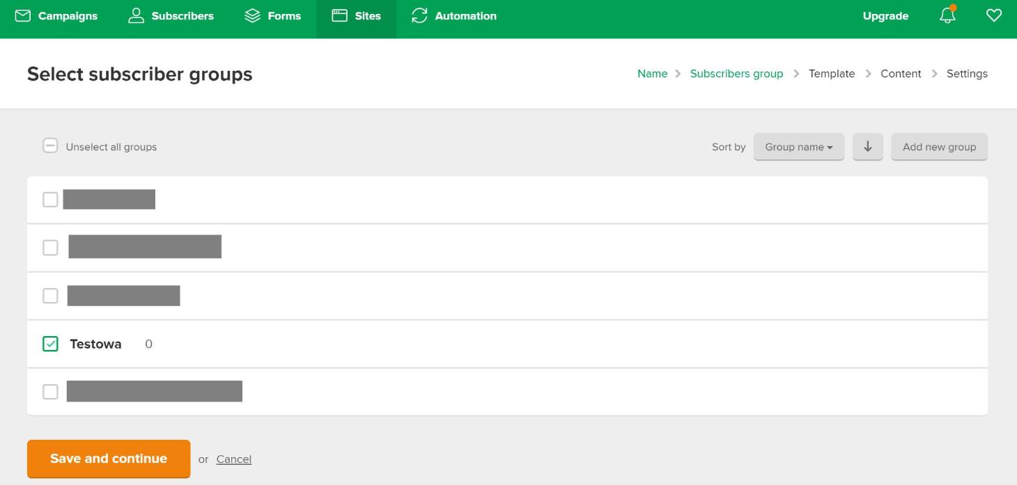 Krok 4. Wybieramy grupę, do której powinny wpadać nasze leady (osoby, które zapiszą się poprzez formularz). Jeśli nie mamy stworzonej grupy to klikamy w opcję "Add new group". Podajemy nazwę grupy i zapisujemy.