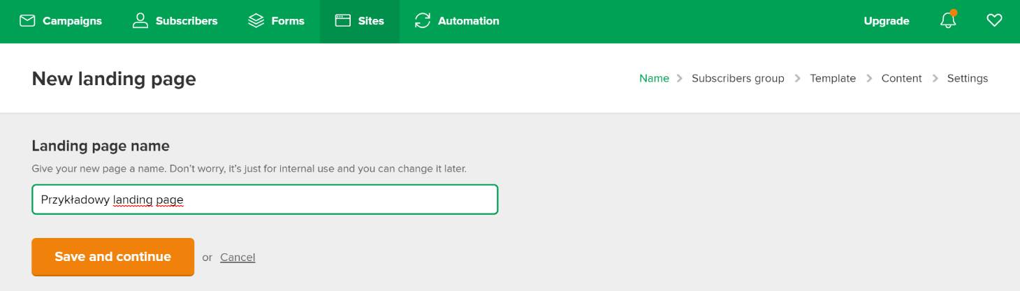 Krok 2. Podajemy nazwę landing page. Warto stronę nazwać tak, aby w przyszłości wiedzieć do czego została konkretnie stworzona.