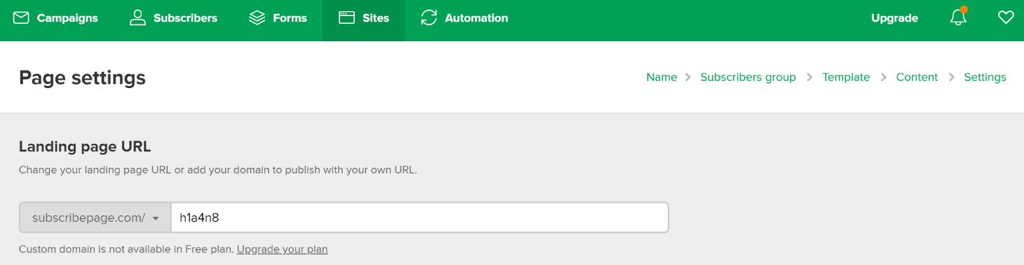 Krok 9. Tworzymy adres url naszego landing page'a. Nazwa w url musi być unikalna. Jeśli korzystamy z darmowego konta, to w nazwie będzie zawarte: [subscribepage.com](http://subscribepage.com/(tutaj), a następnie wyraz przez nas dodany. Przykład, jeśli wpisaliśmy nazwę: jakzrobicmiod, to nasz landing page będzie dostępny pod adresem: subscribe.com/jakzrobicmiod.