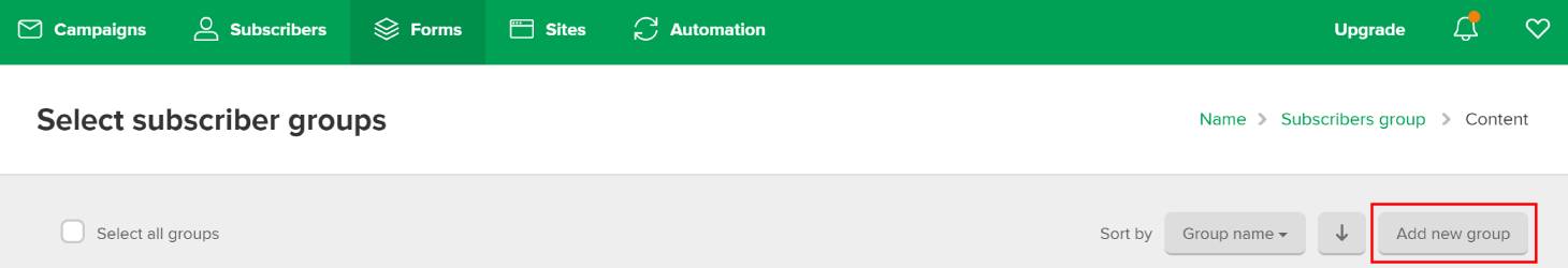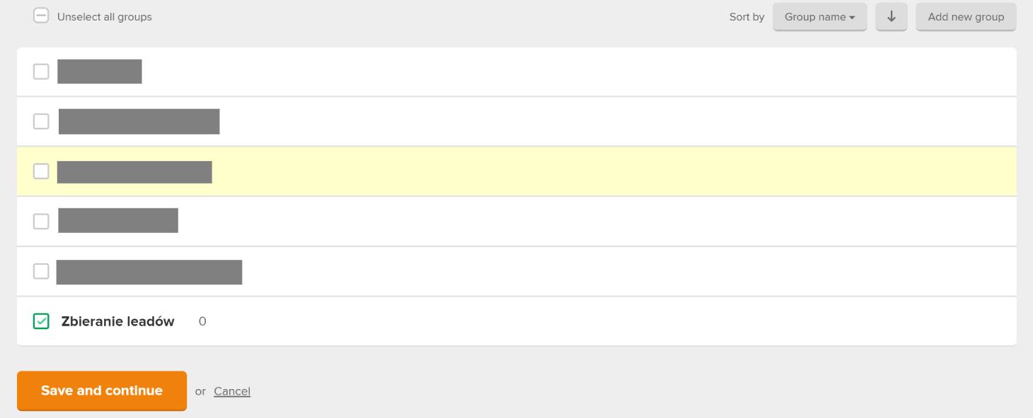 Krok 4. Wybieramy grupę, do której powinny wpadać nasze leady (osoby, które zapiszą się poprzez formularz). Jeśli nie mamy stworzonej grupy to klikamy w opcję "Add new group". Podajemy nazwę grupy i zapisujemy.