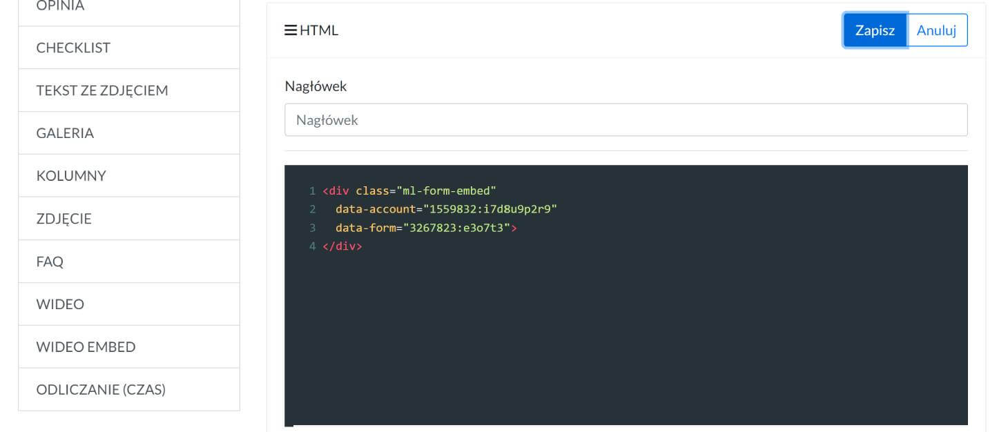 Krok 7. Rozpoczynamy etap tworzenia formularza. Oczywiście możemy dodać większą ilość pól czy ustawić dodatkowe opcje przy formularzu (typu checkbox, politykę prywatności, itp.)