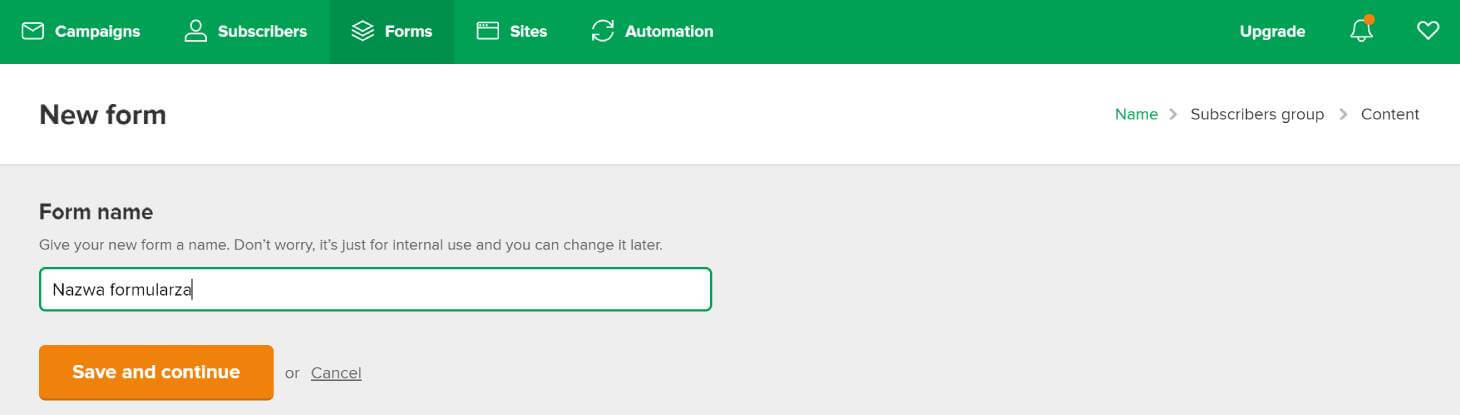 Krok 2. Podajemy nazwę formularza. Warto nazwać go tak, aby w przyszłości wiedzieć do czego został konkretnie stworzony.