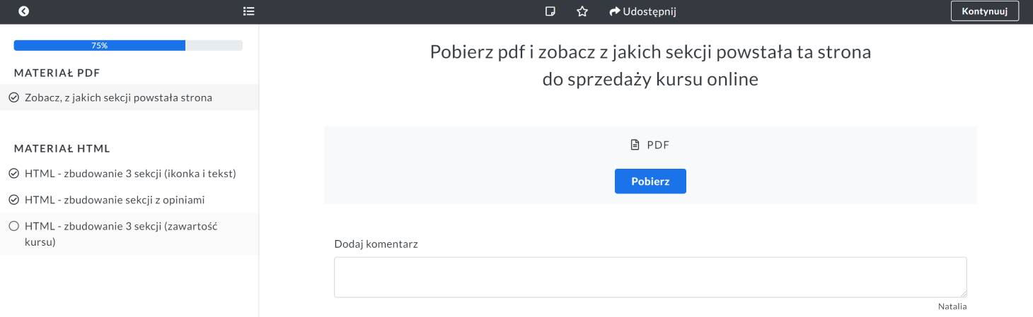 Każdy student w panelu nauki ma możliwość mierzenia swojego postępu w przerabianiu kursu. A wizualizuje to jemu tzw. pasek progressu. Czyli informuje on jaki % kursu został ukończony i ile zostało do końca. Taką samą informację, otrzymuje też twórca w swoim panelu w Skyier . Dzięki temu on również wie, który student jest na jakim etapie. I dla ilu udało się już przerobić kurs w 20, 30, 50, czy w 100 procentach.