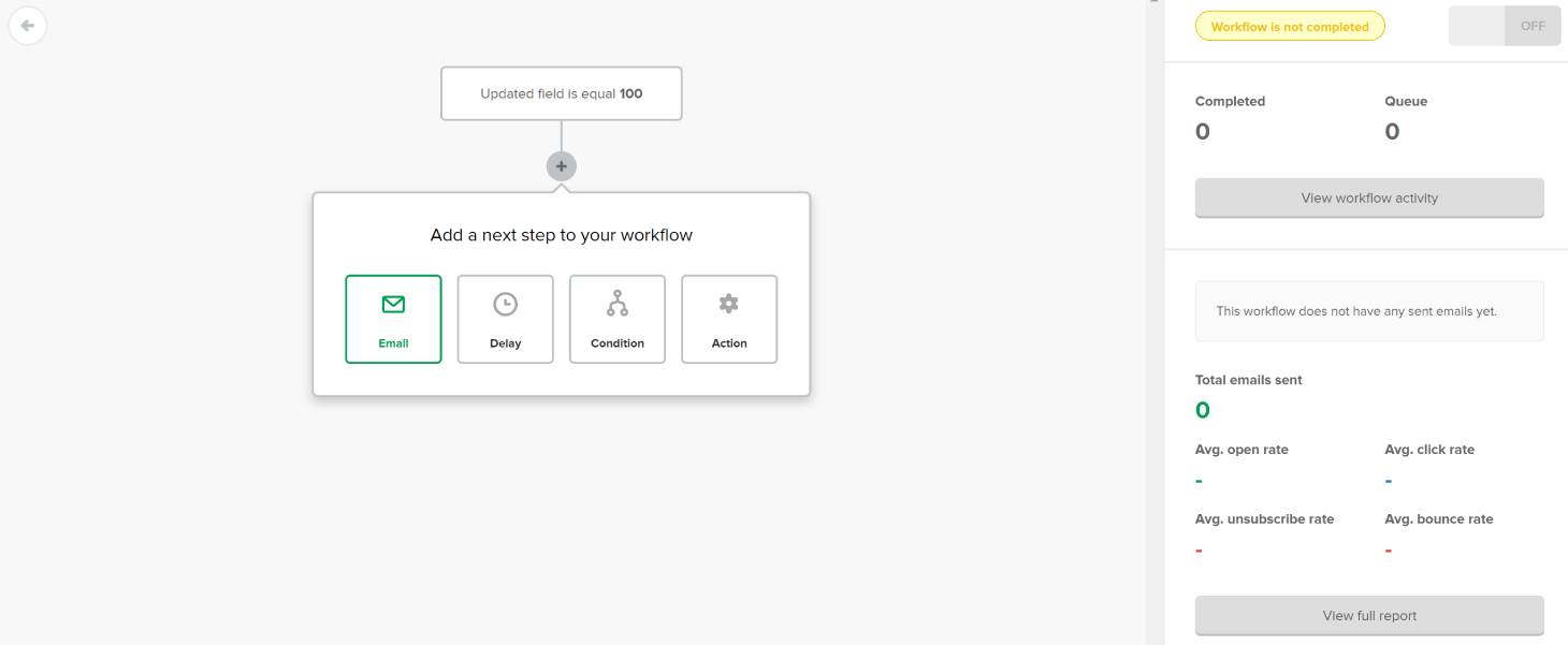 Poniżej prezentuję najprostszą ścieżkę, jaką możesz stworzyć, kiedy chcesz wysłać maila z gratulacjami dla osób, które ukończyły dany kurs w 100%.