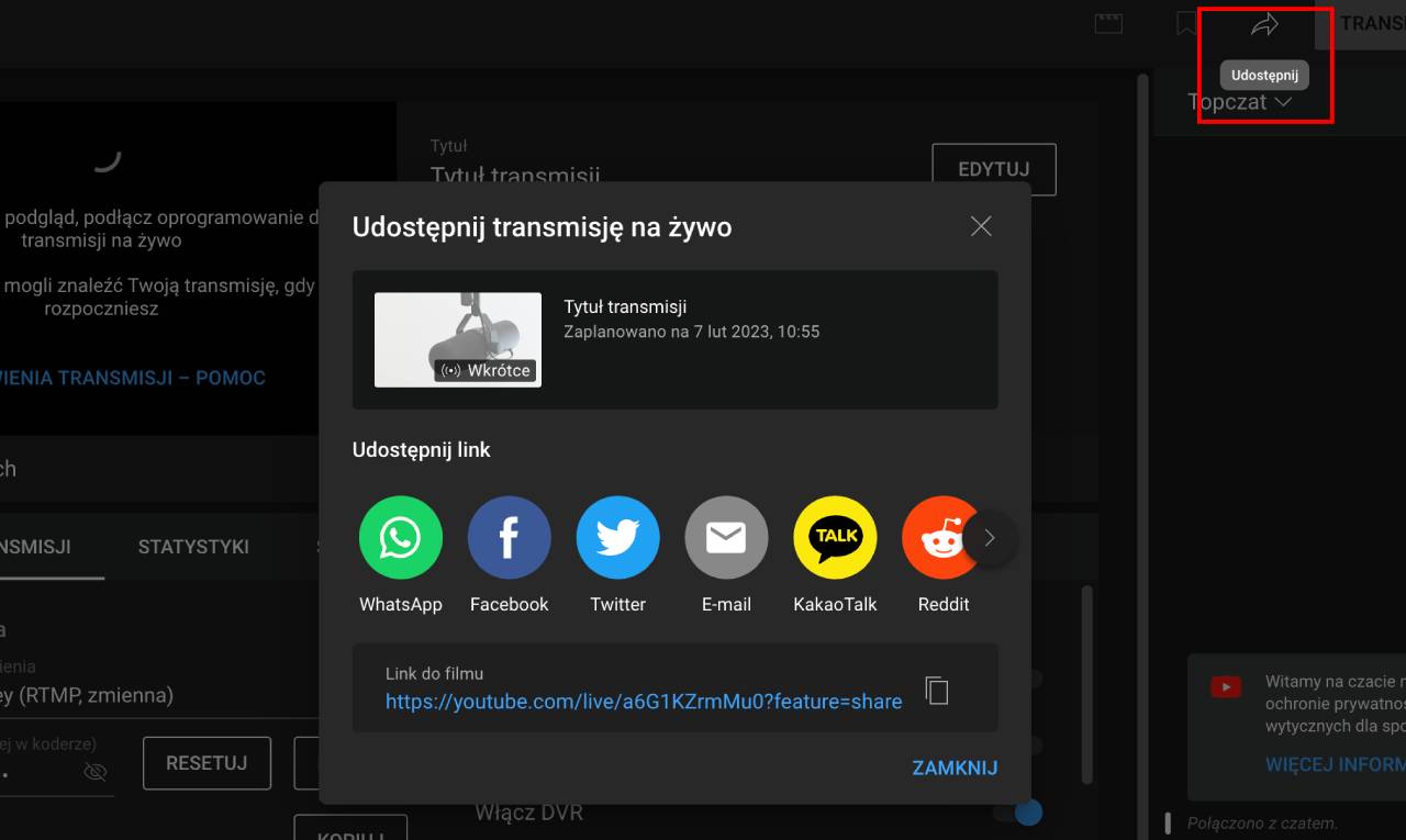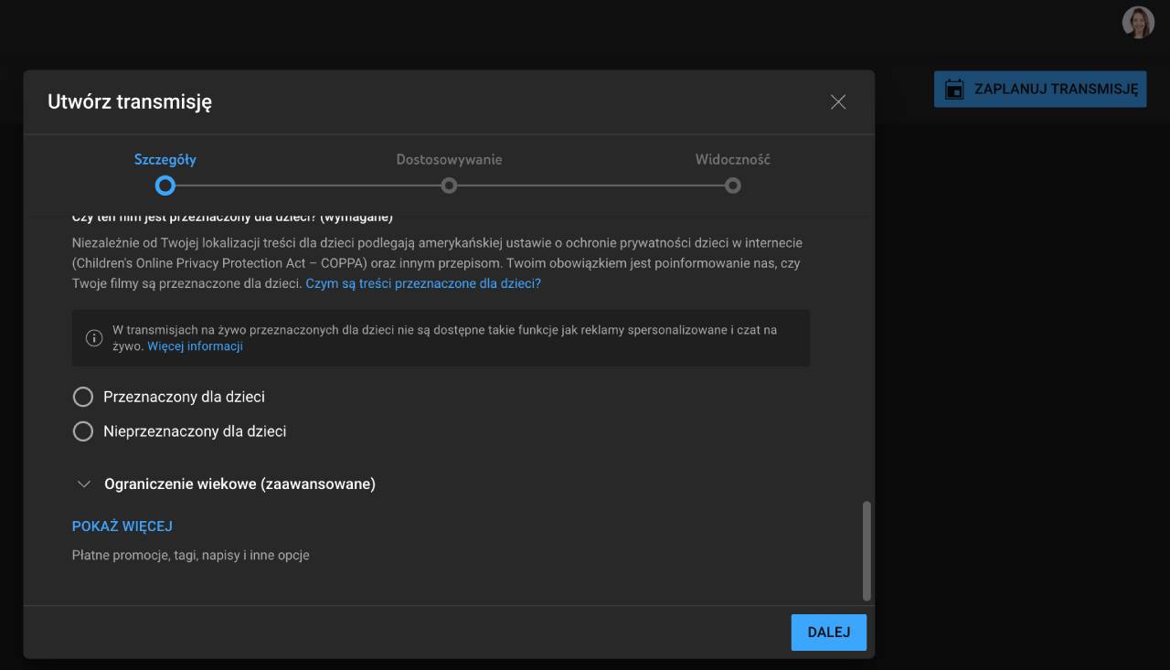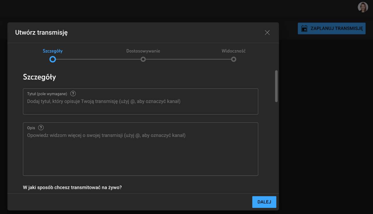 KROK 3. Wybierz Zaplanuj transmisję. I przejdź przez 3 krokowy formularz.
