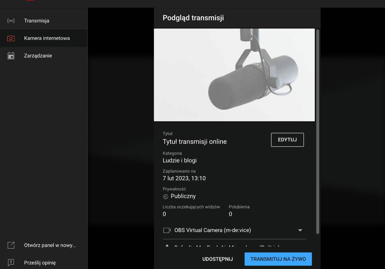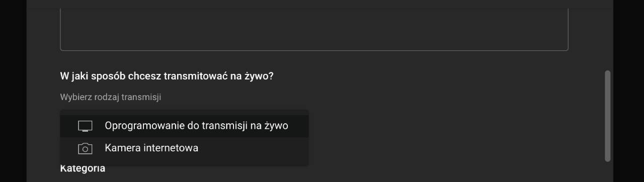 Ważne. W kroku - W jaki sposób chcesz transmitować na żywo wybierz opcję Kamera internetowa. Wybranie opcji Oprogramowanie transmisji na żywo oznacza, że chcesz skorzystać dodatkowo z narzędzi zewnętrznych (typu OBS, StreamYard).