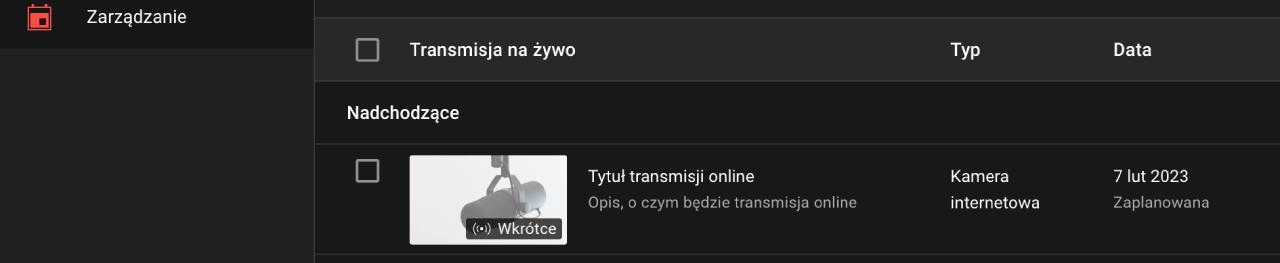 KROK 7. W dniu webinaru wejdź na konto YT, a następnie wybierz: Transmituj na żywo → Zarządzanie → wybierz wydarzenie → Kliknij Transmituj na żywo.