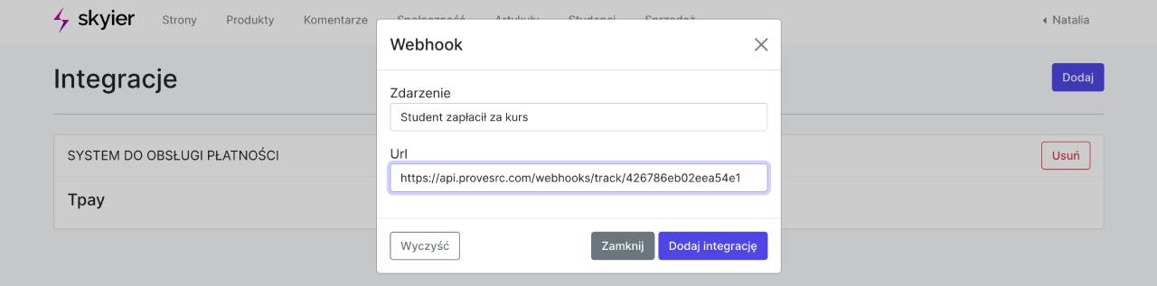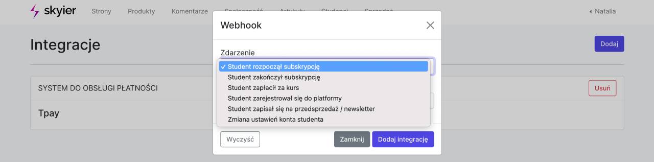 Krok 4. Przechodzisz do platformy Skyier → Integracje. Wybierasz na liście z integracjami opcję Webhook. A następnie event, który chcesz w tym wypadku śledzić.