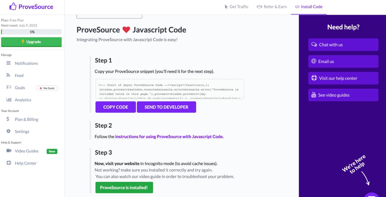 Krok 1. W ProveSource należy wejść: w Install Code → wybrać Javascript Code → a następnie skopiować cały dostępny kod.