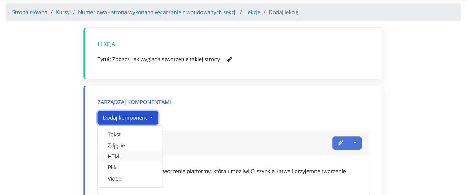 Krok 1. Przechodzimy do zakładki Lista lekcji i wybieramy, na jakim poziomie chcemy dodać quiz.