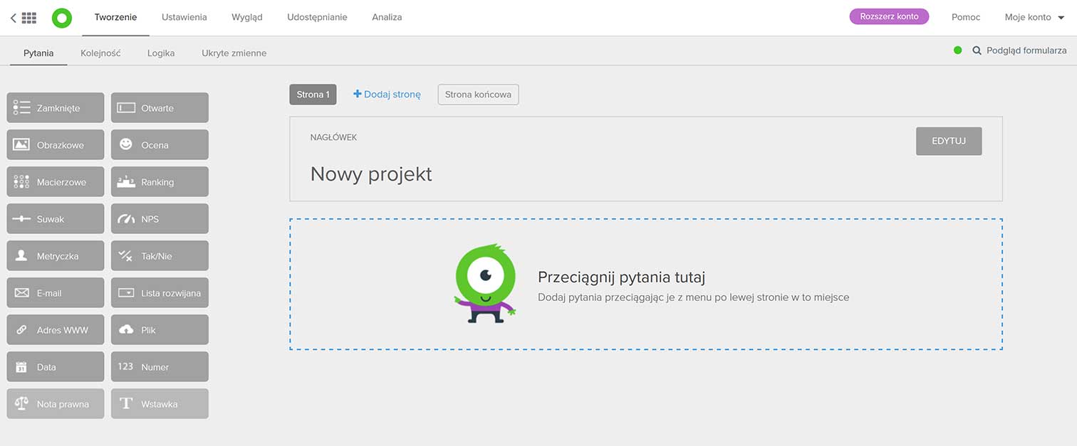 Interankiety to kolejny program do tworzenia między innymi rozbudowanych quizów. W tym wypadku masz edytor oparty o drag and drop. Czyli quiz tworzysz poprzez przesuwanie wybranych sekcji. Jego podstawowe funkcje to: